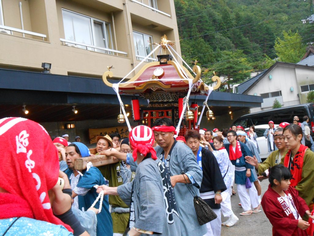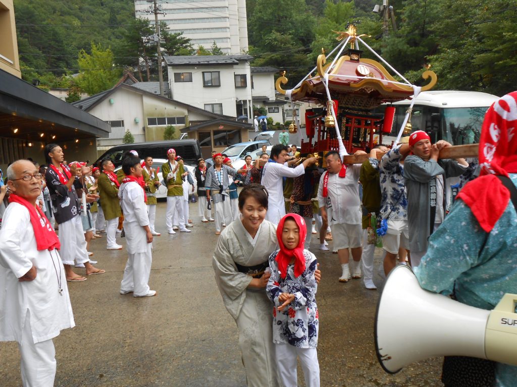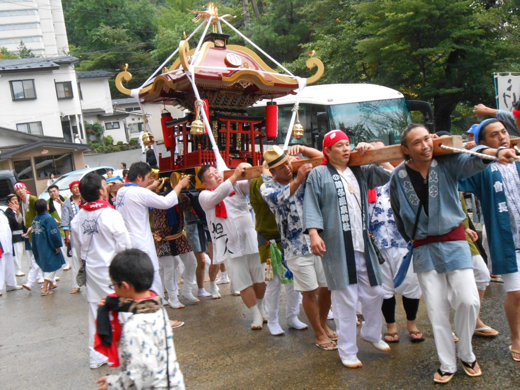 神輿を担ぎ、町内をまわる神輿渡御(みこしとぎょ)。鳴子ホテルがゴールです。