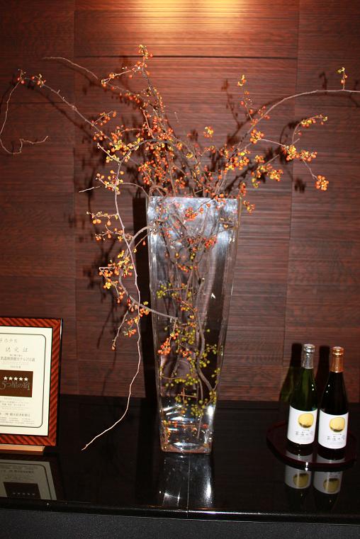 ガラスの花瓶に「つる梅もどき」を飾っています。