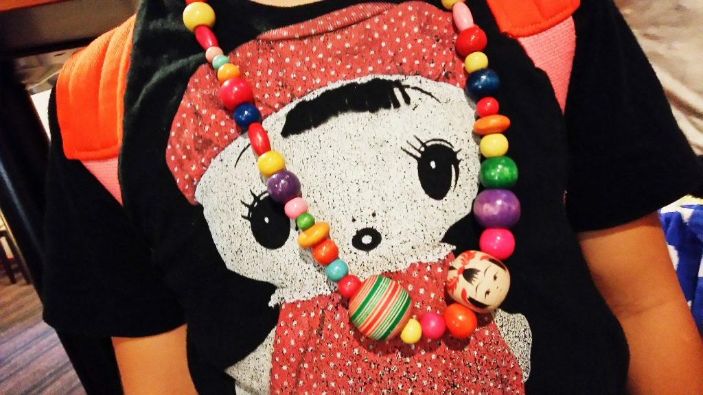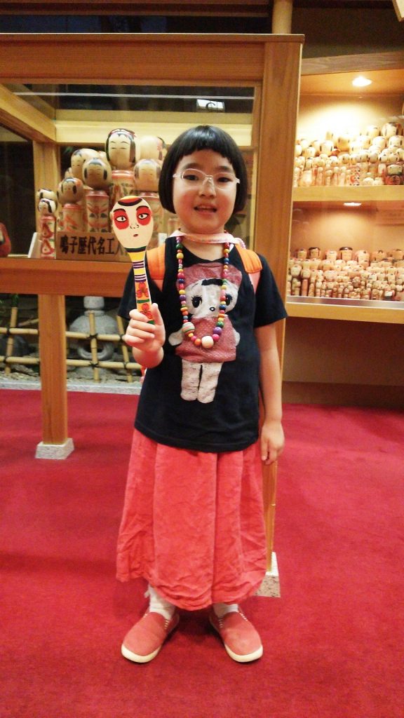 こけしのしゃもじを片手に、ネックレスもTシャツもこけしという