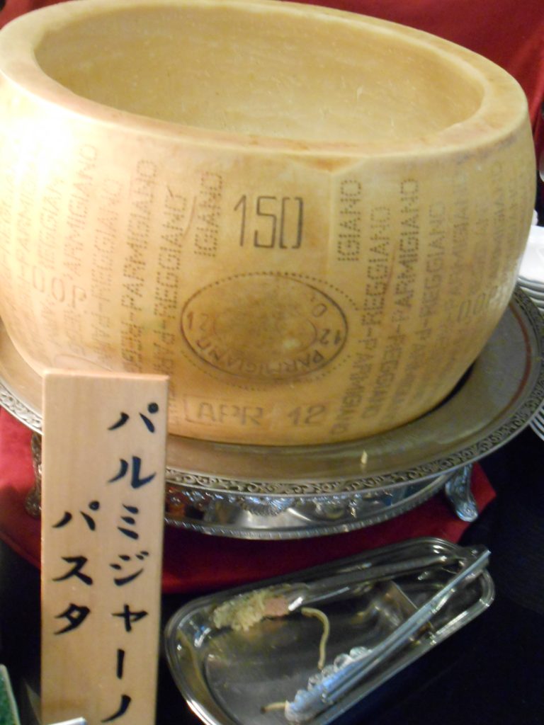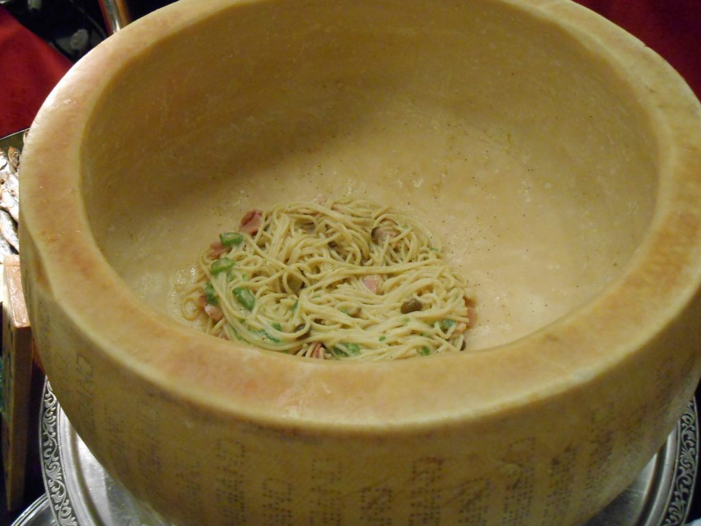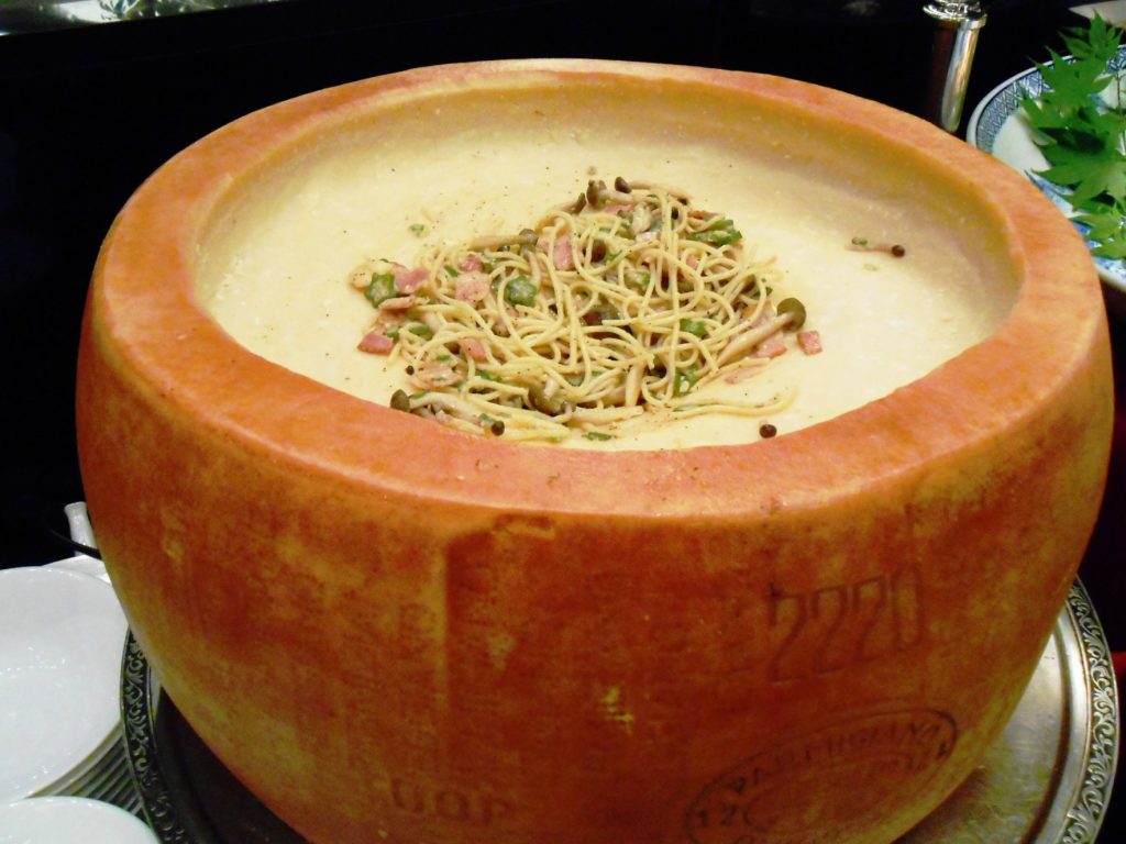 大きなパルミジャーノチーズの中で絡めてお召し上がりください。