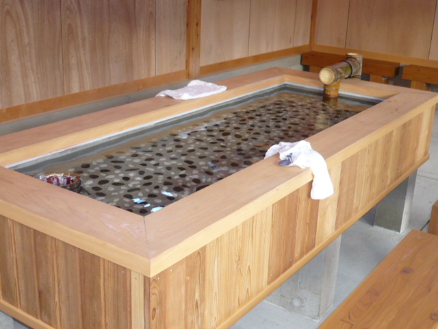 そこには、{手湯}があります。ベンチに腰掛けて手でお湯の感触を
