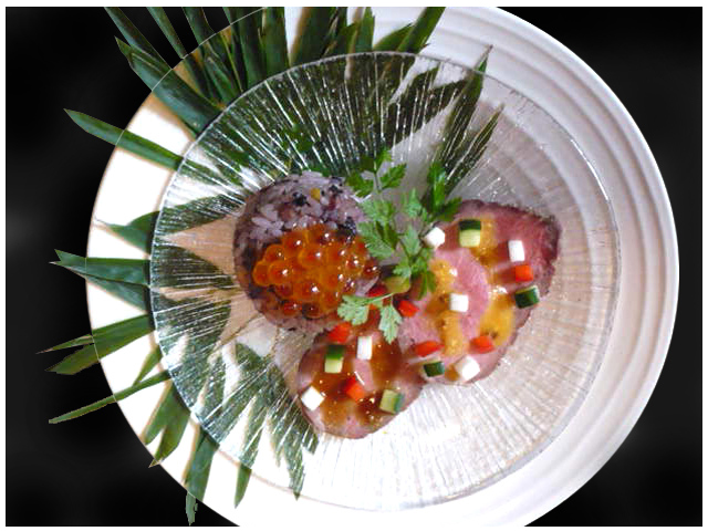 ローストビーフの上には、赤や緑の色鮮やかな野菜を散りばめました。