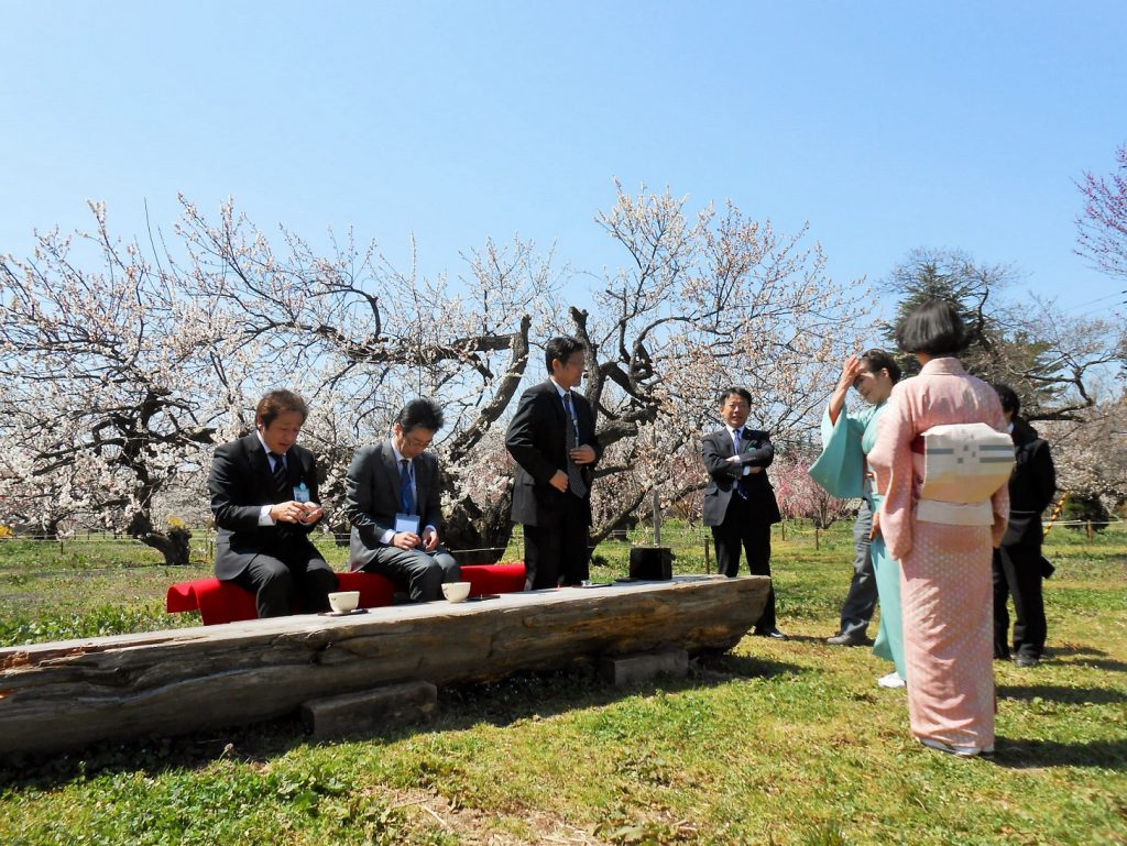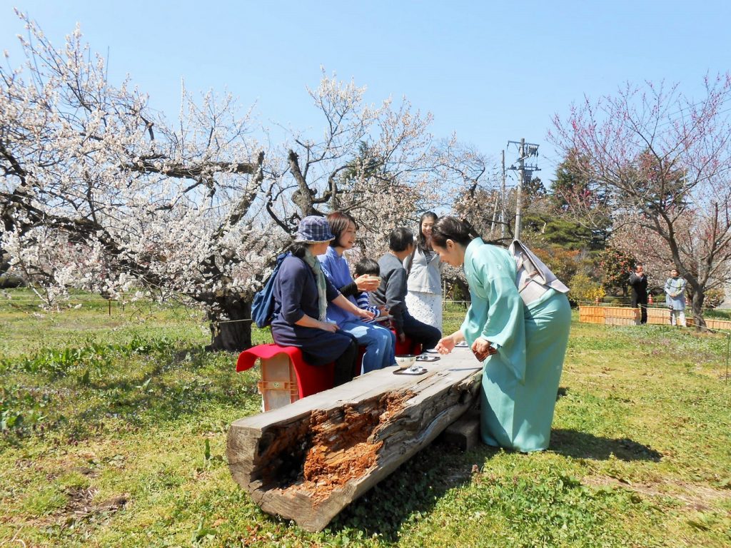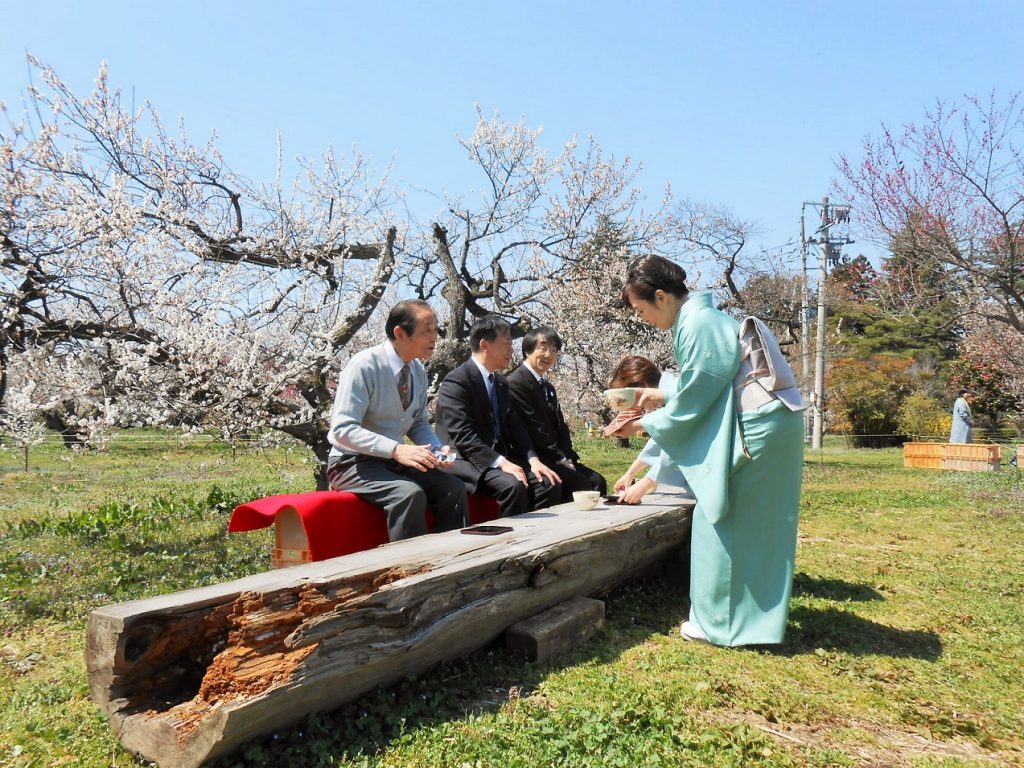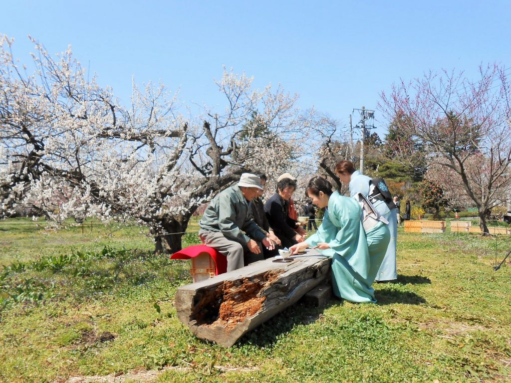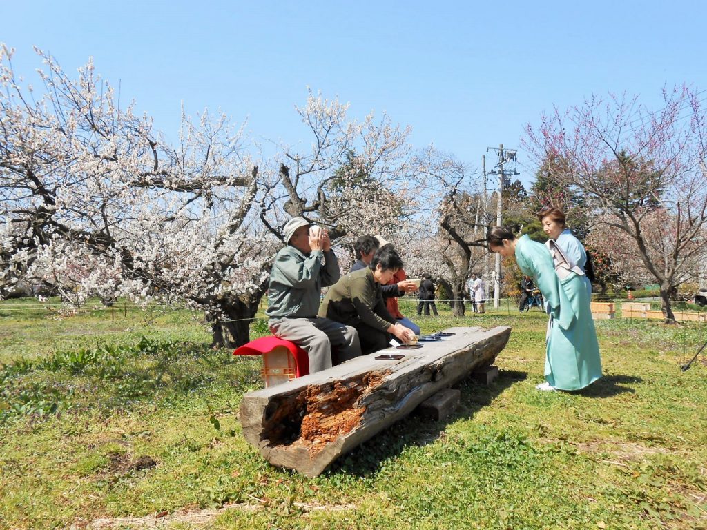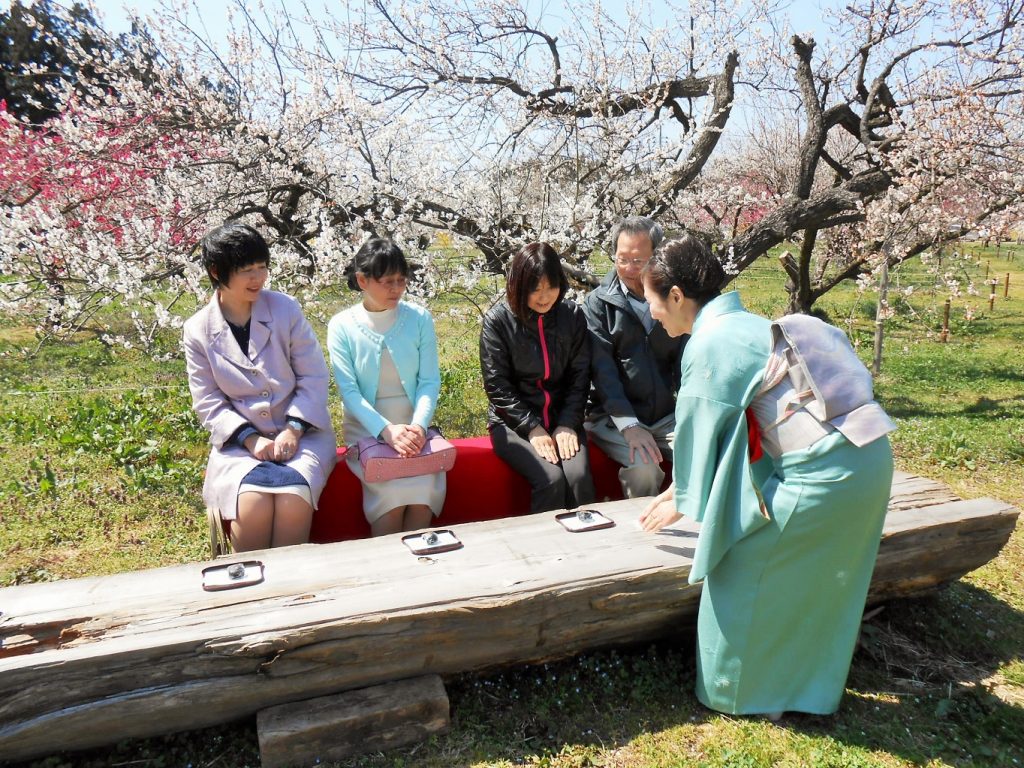 綺麗な梅や桜、レンギョウに囲まれながらのお茶会です。