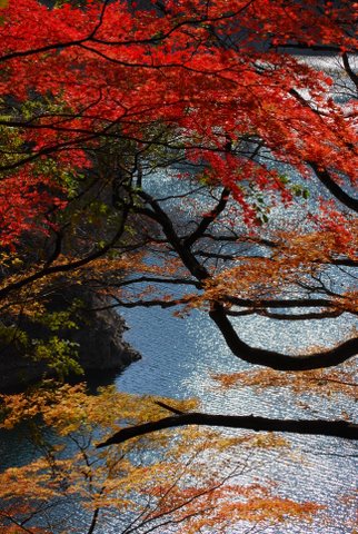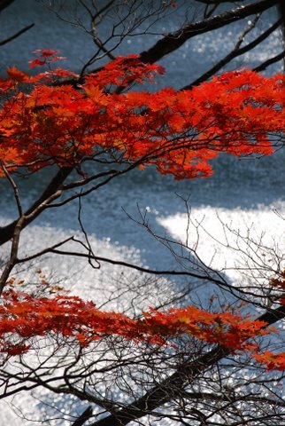 紅葉したの赤色と、川の水色が