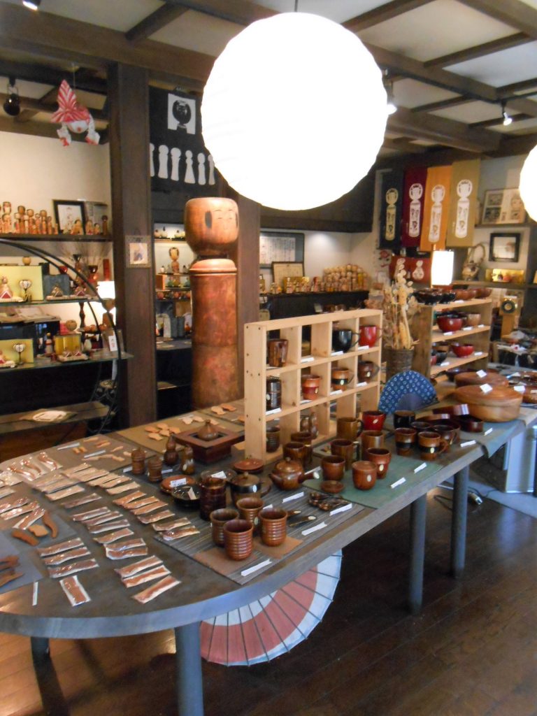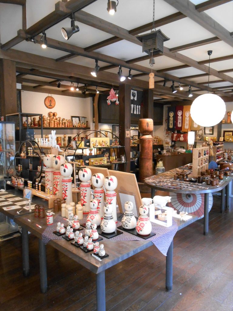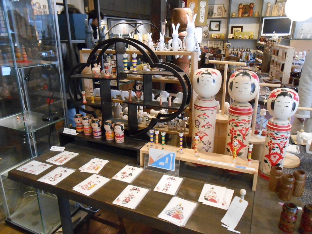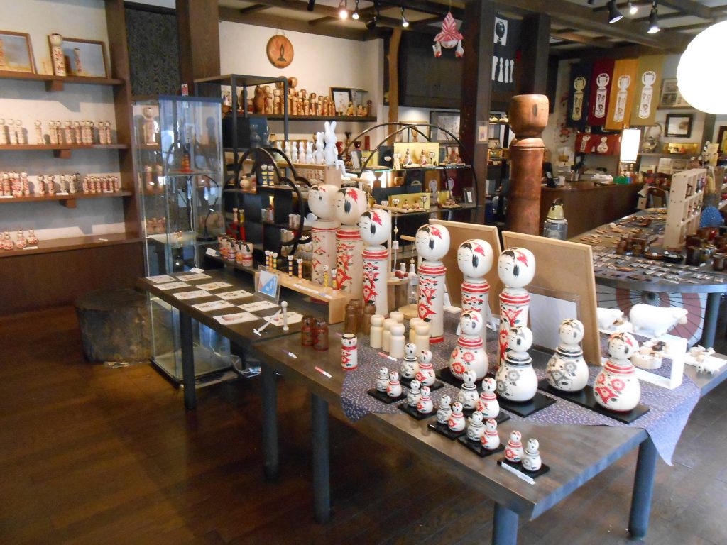 たくさんの種類のこけしや雑貨などが販売されています。