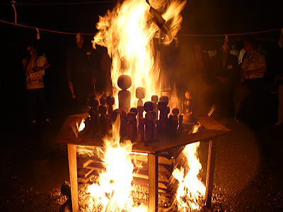 それを温泉神社の境内で井桁に組んだ櫓とともにお炊き上げをするのです。