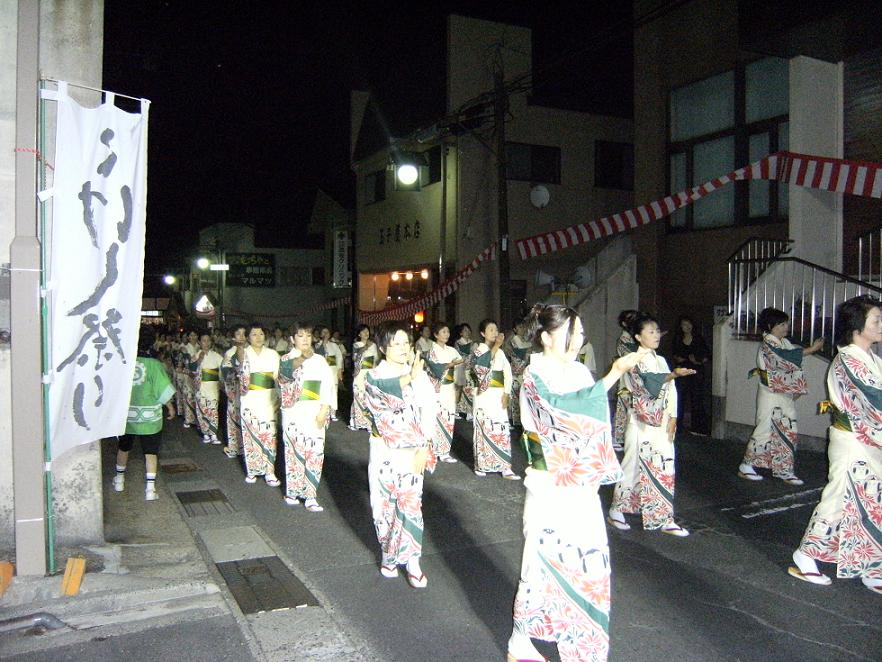 皆さん黄色いこけしの浴衣を着て、温泉街を盆踊り♪