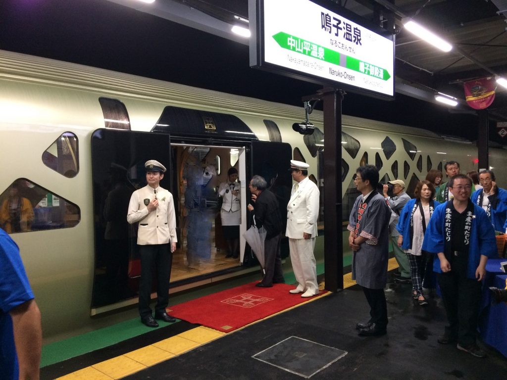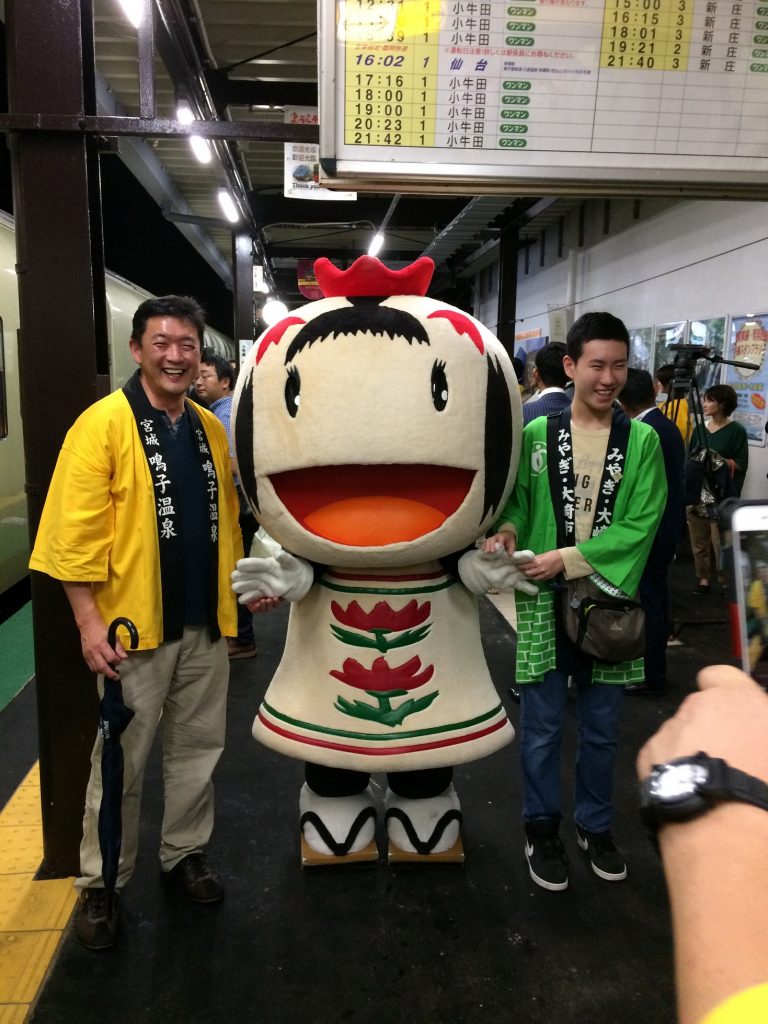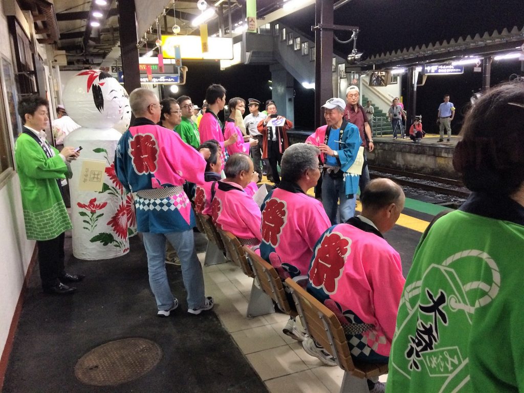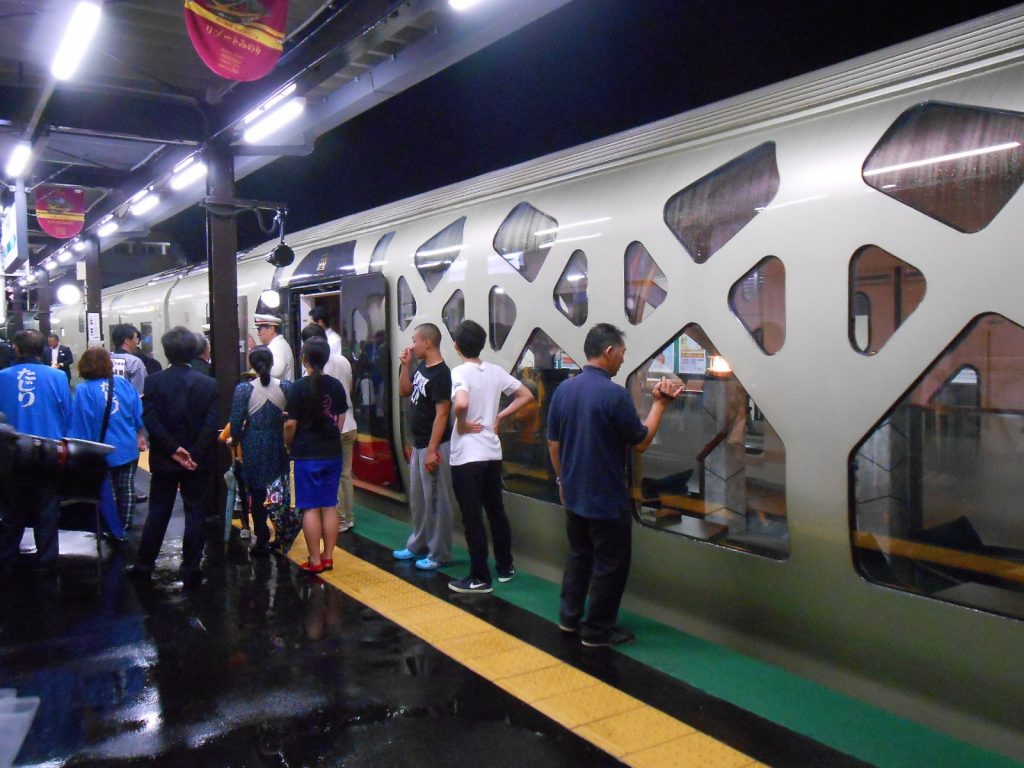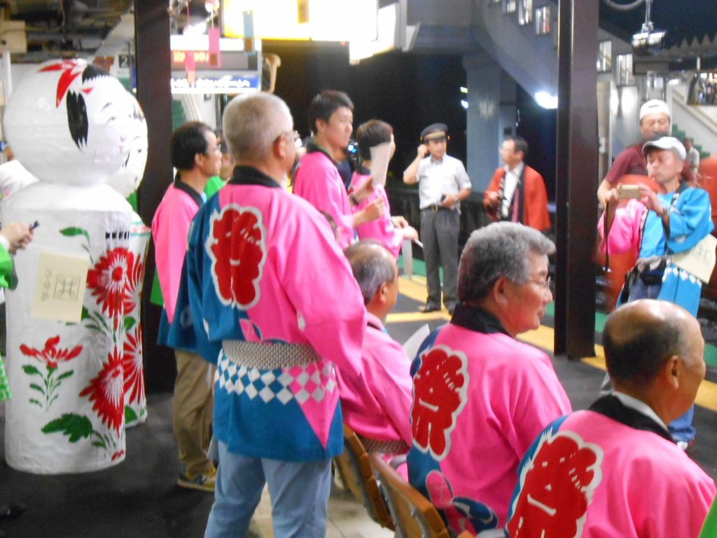 ホームでは約150名の人が旗をふり、お出迎えをしました。