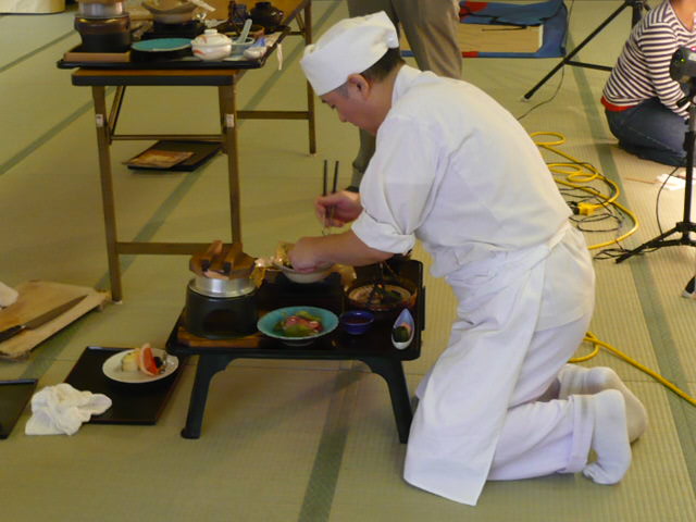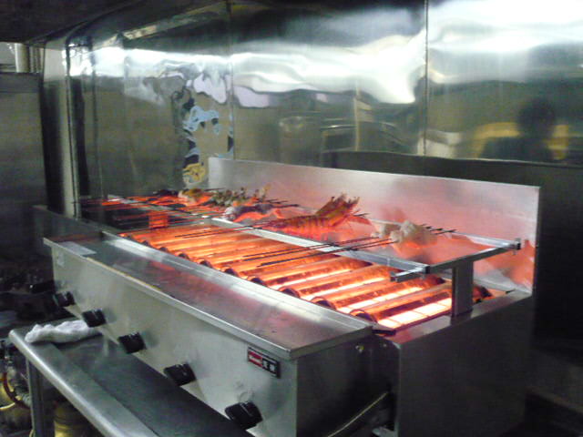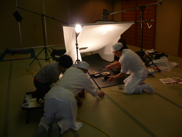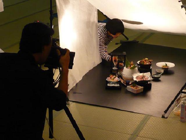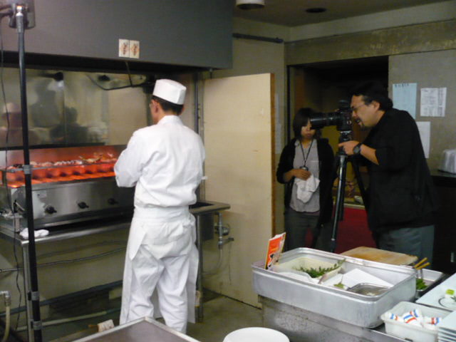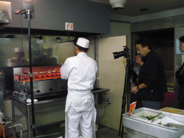 午後は3F料亭「チョイス料理」の撮影です。社員もモデルになって、接客の風景を撮影しました。こちらは、調理人が魚やエビを焼くところを撮影。