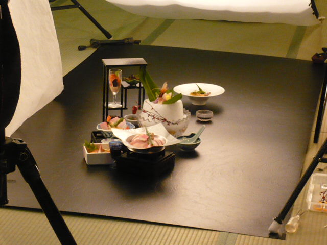 ①料理を前後にずらし、遠近法を用いてバランスを調節
