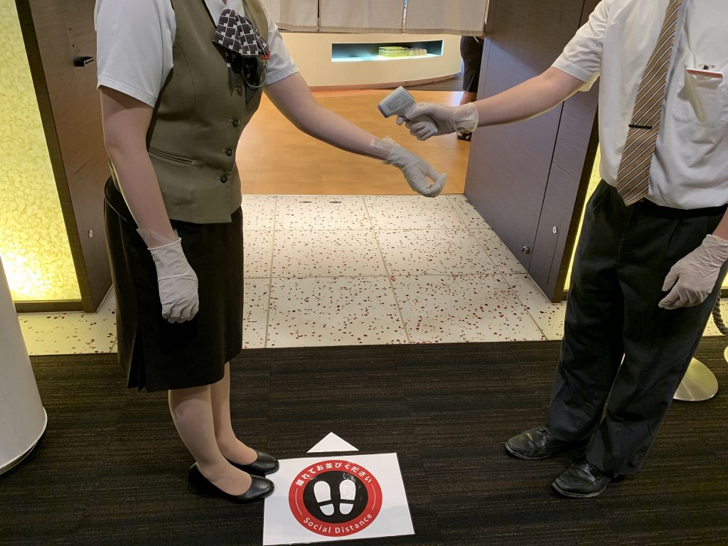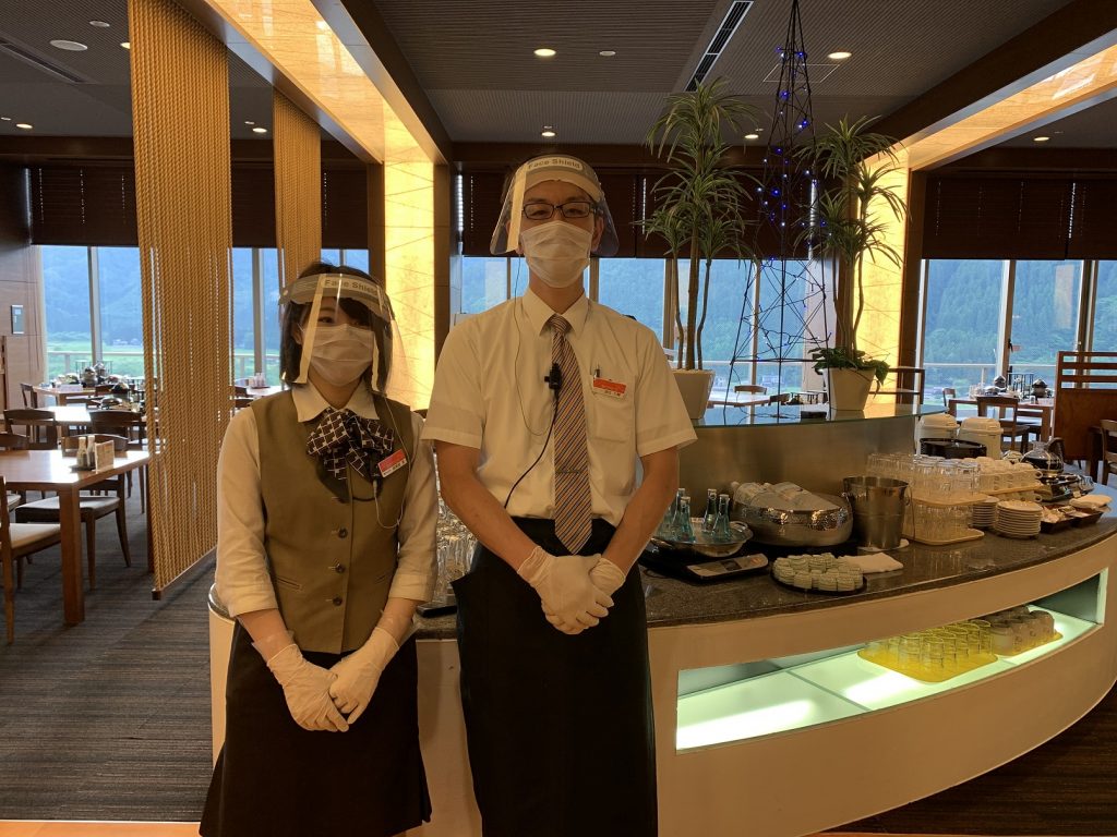 スタッフは、マスクと手袋、フェイスシールドをつけお出迎え。