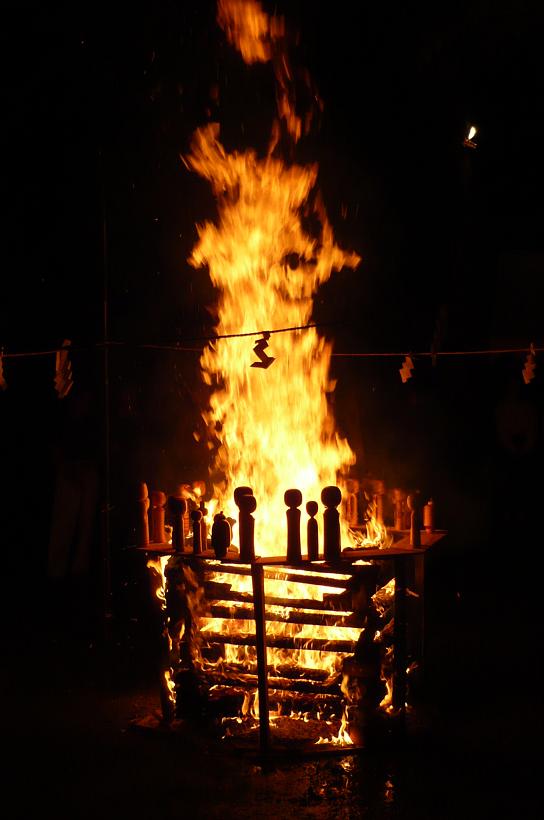 女性コーラス隊の歌をバックに、こけしが燃えていきます。